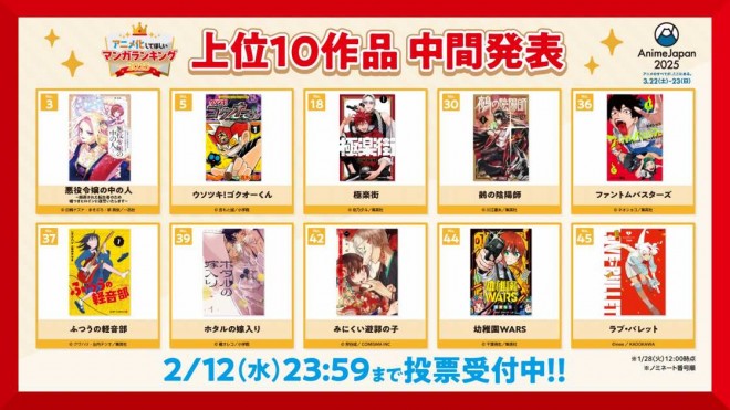 The interim results for the "Most-Wanted Manga for Anime Adaptation" ranking—an annual highlight of AnimeJapan 2025, one of the world's largest anime events—have been announced.