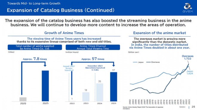Avex’s video streaming service AnimeTimes was also highlighted. Over the past five years, the platform has expanded its catalog of new and legacy titles by a factor of 7.8. This growth has led to a steady increase in subscribers both in Japan and abroad.