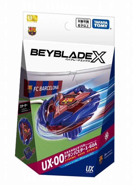 A starter set including a Beyblade (spinning top) and a winder launcher. The Dronebuster 1-60A and the winder launcher come in a special color version that reflects FC Barcelona's team colors. The FC Barcelona logo is featured in the center of the blade.